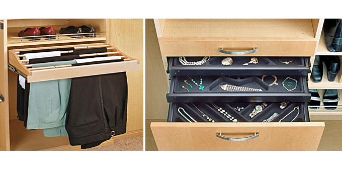 - The pull-down clothes bar. This side mounted, pull down bar is perfect for hanging and displaying shirts, blouses, pants and skirts without having to worry about them becoming wrinkled. This clothes bar is available in multiple sizes and has an adjustable rod length so that you can choose the measurement that works best for your closet space. The bar accommodates universal closet designs and can be adjusted to fit handicap accessible applications.